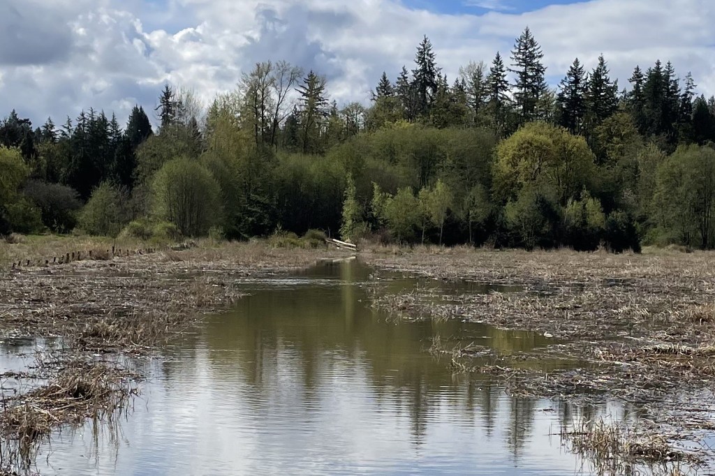 The path from Brydon Lagoon across the fields to the Nicomekl River bridge and to Surrey’s Hi Knoll Park was completely flooded. We surmised that it was due to beaver activity.