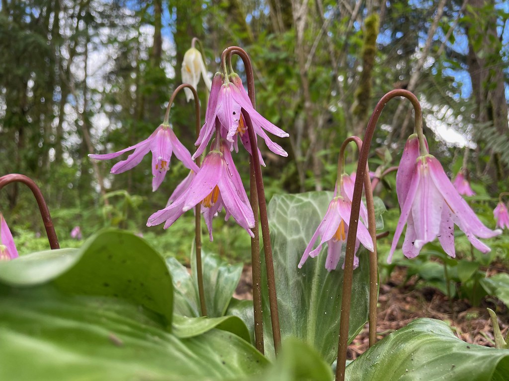 Because of the flooding most of us drove to Hi Knoll Park. We try to time our visit to this park for when the Fawn Lilies and Trilliums are blooming. The rare purple and white Fawn Lilies were blooming – so were the Trilliums. Trilliums are white but turn purple with age. Salmonberry, Twinberry, Indian Plum, Red Currant and Oregon Grape were blooming and there were several fungi species.