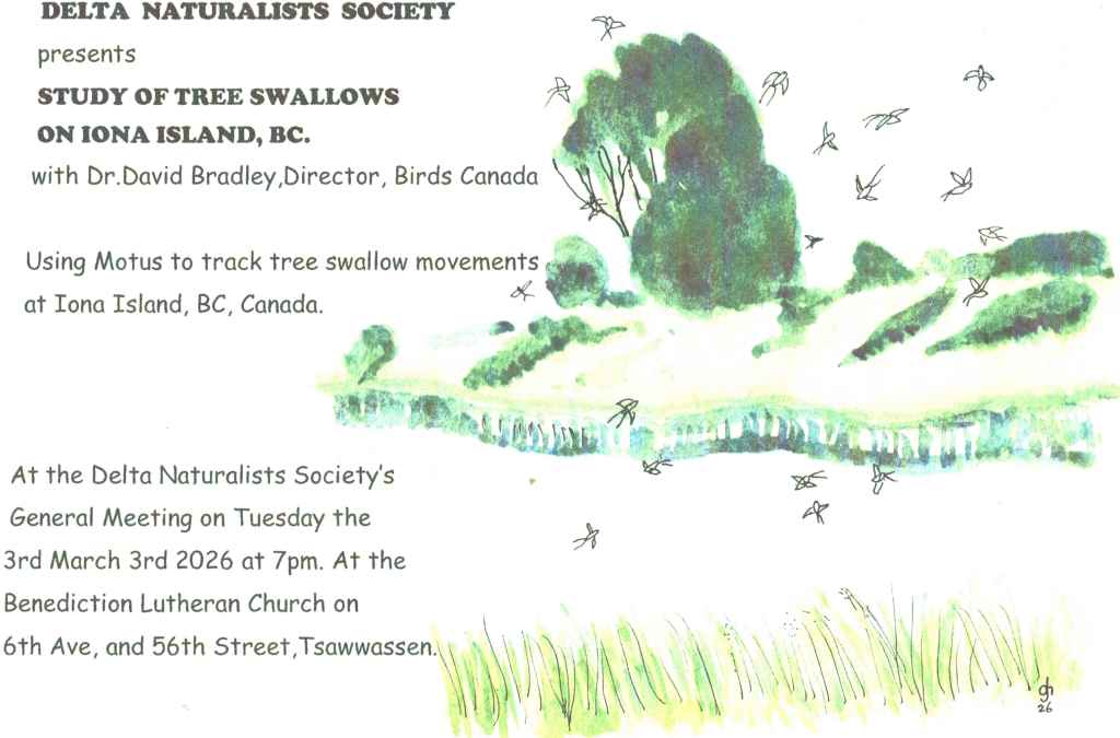 | March Date: Tuesday 3rd, 2026 IN PERSON Social time 7:00 – 7:30 pm, DNS Business 7:30 – 8:00 pm Presentation 8:00 – 9:00 pm Guest Speaker: David Bradley Topic: Using the Motus Wildlife Tracking System to study Tree Swallows at Iona Island |