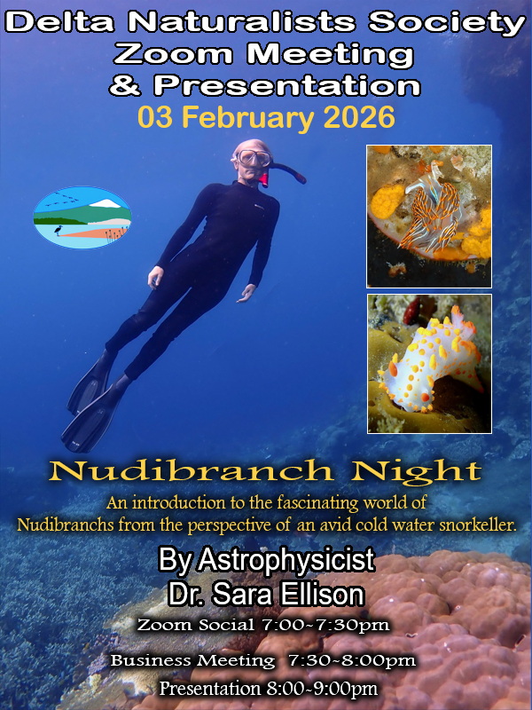 | February Date: Tuesday 3rd, 2026 ZOOM ONLY Zoom Social time 7:00 – 7:30 pm, DNS Business 7:30 – 8:00 pm Presentation 8:00 – 9:00 pm Guest Speaker: Sara Ellison Topic: Nudibranch Night |
