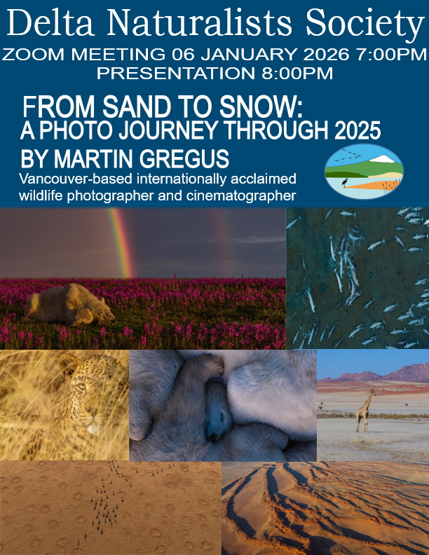 | January Date: Tuesday 6th, 2025 ZOOM ONLY Zoom Social time 7:00 – 7:30 pm, DNS Business 7:30 – 8:00 pm Presentation 8:00 – 9:00 pm Guest Speaker: Martin Gregus Jr. Topic: From Sand To Snow: A Photo Journey Through 2025 |