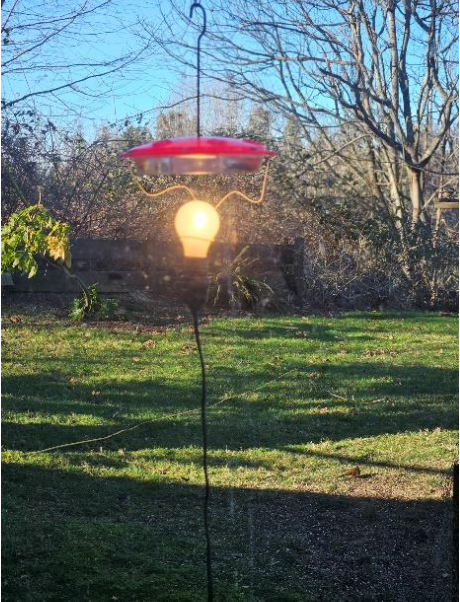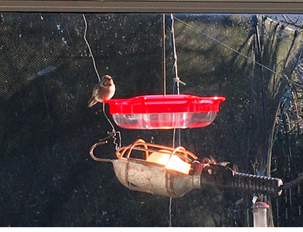 I put a 75 watt bulb in it and it has kept the feeder water liquid all morning and birds don’t care about the light. We have two regulars–a male and a female Anna’s–who contentedly feed. We’ll see how it works in the evening when it gets really cold.