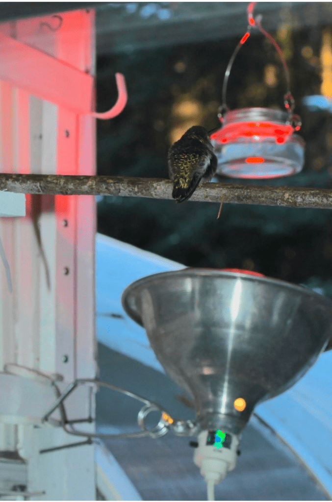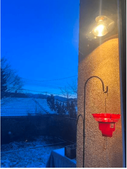 Warmed feeders should be kept out and turned on all night. The Anna’s need to feed very early – at first light- after a long, cold night.