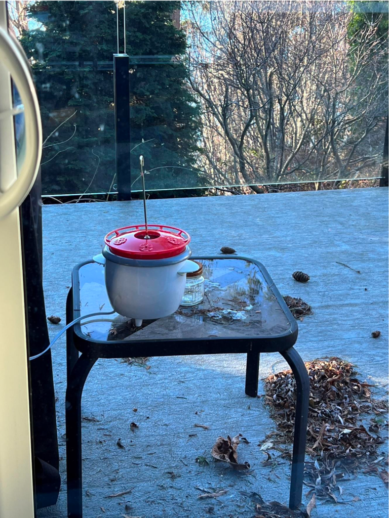 6) DNS member – I use a heat lamp and the bird spends hours perched in the warm air around the feeder