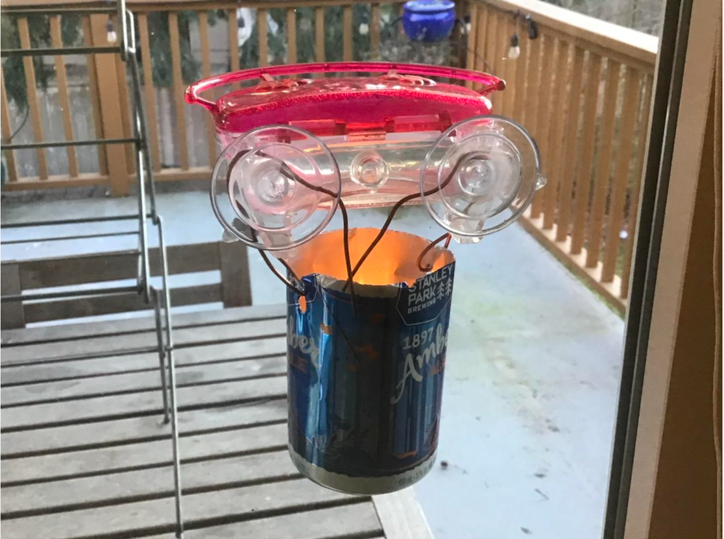 For our window hummer feeder, made a heater from a beer can, some wire and put a tea light in it for heat source. Tea lights last about 3 or 4 hours