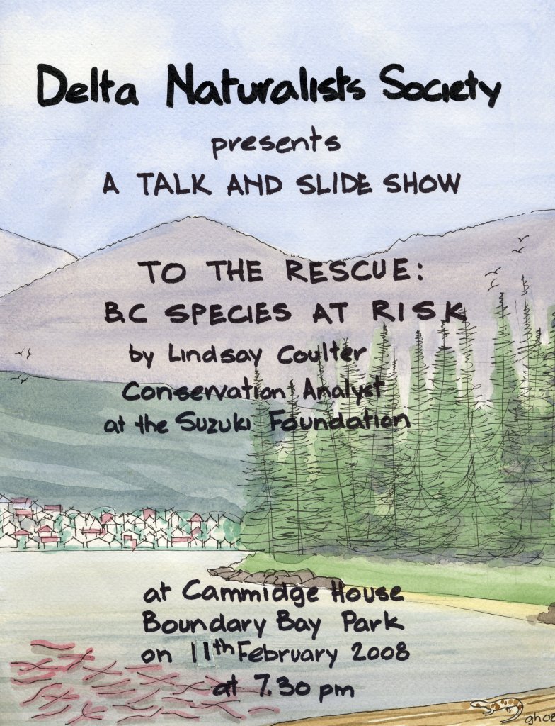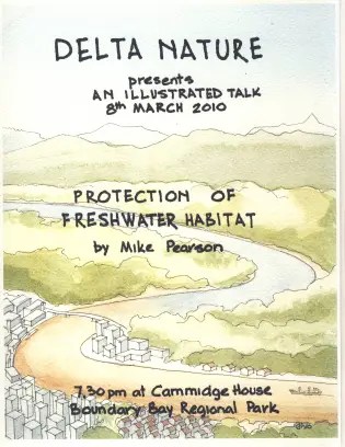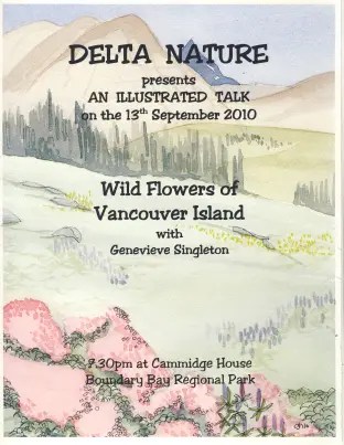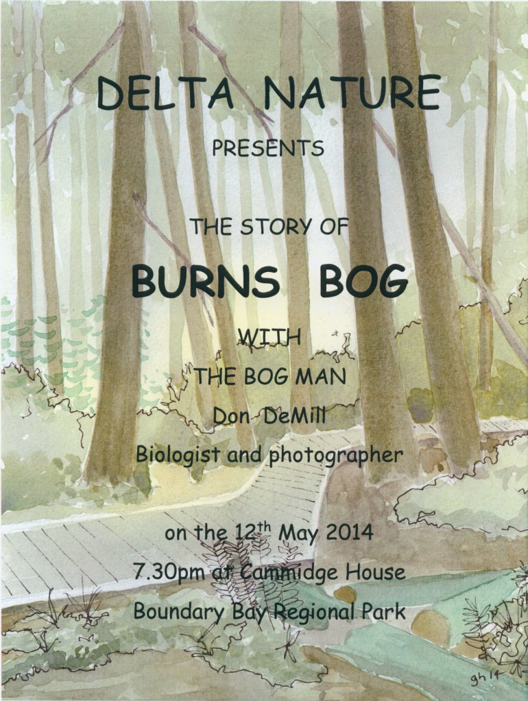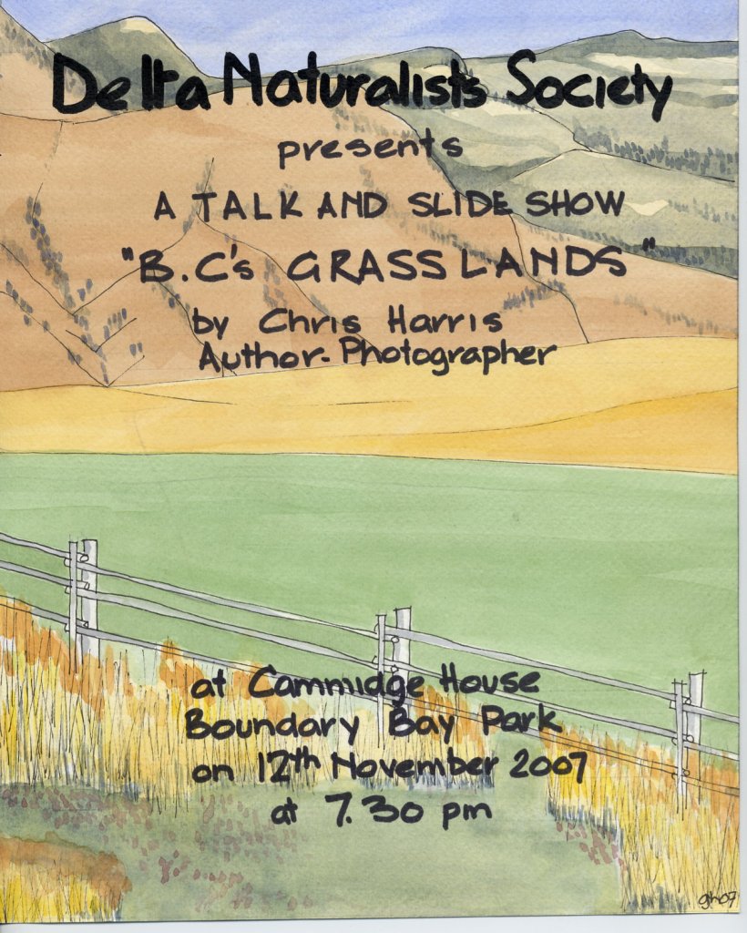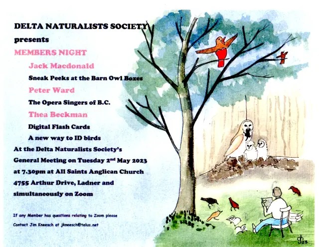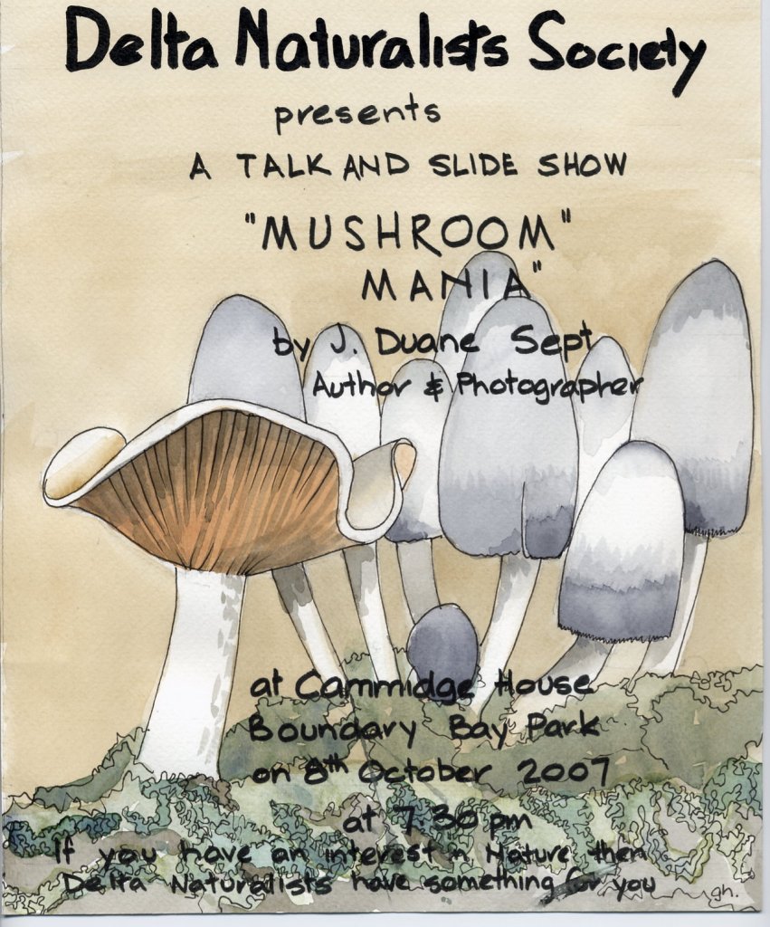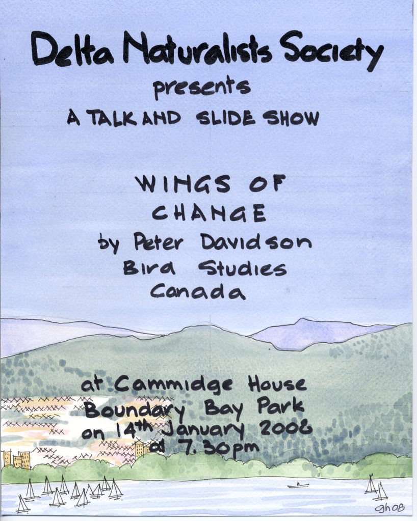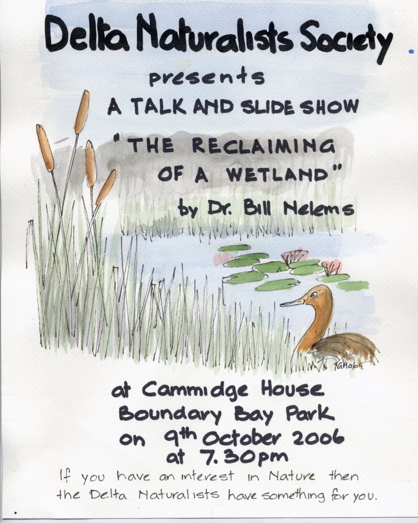 Geof and Jean joined the Delta Naturalists’ Society, and he was asked to create a poster for the October 2006 meeting. Geof has produced a poster to illustrate the theme of the speaker for every DNS monthly meeting since October 2007. He also designed the logo used by the Delta Naturalists’ Society.